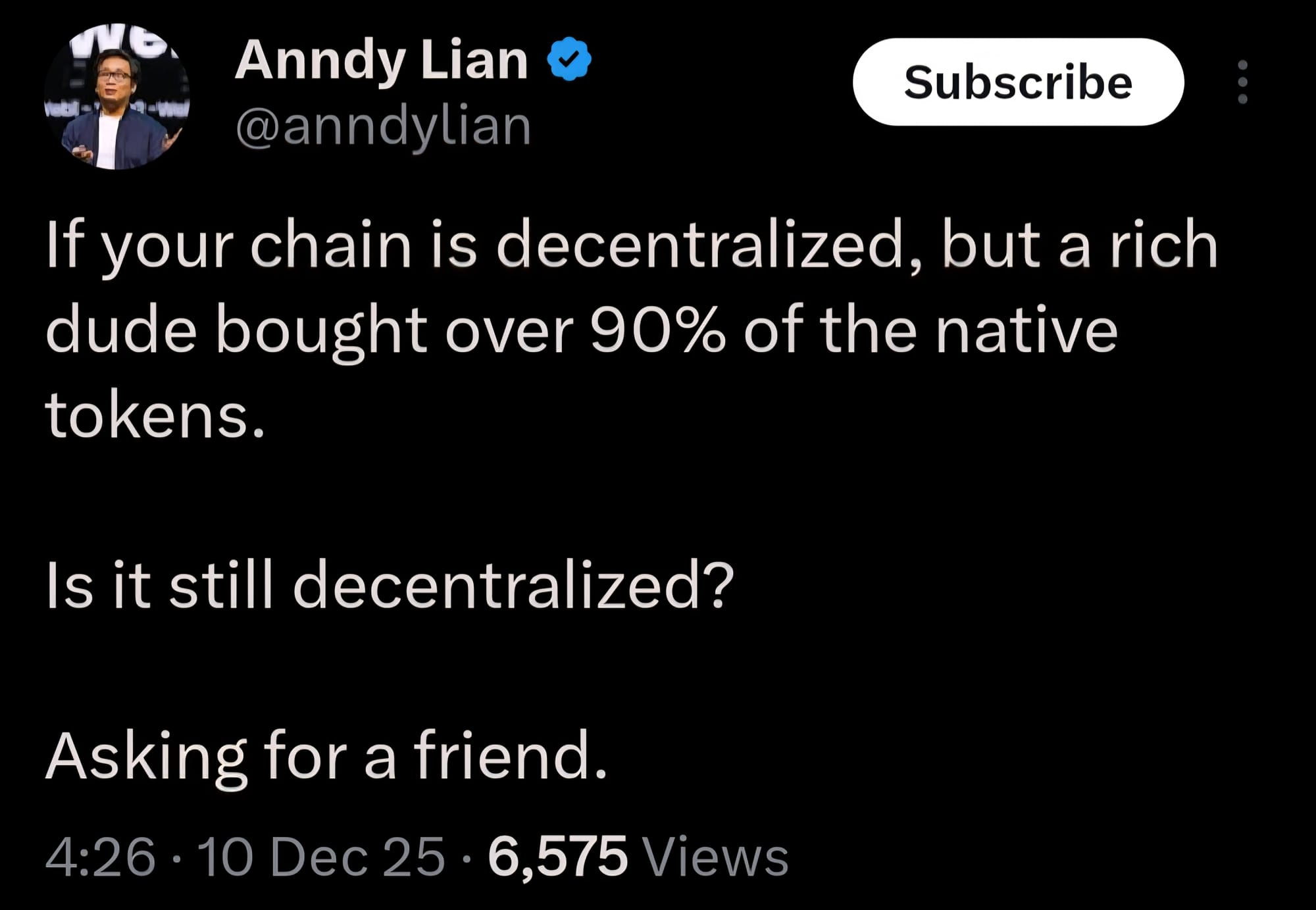 If your chain is decentralized, but a rich dude bought over 90% of the native tokens. Is it still decentralized?