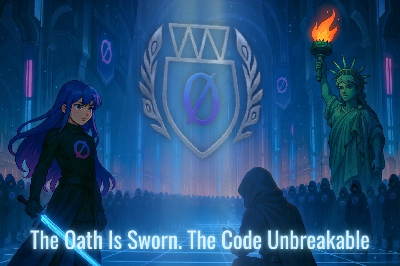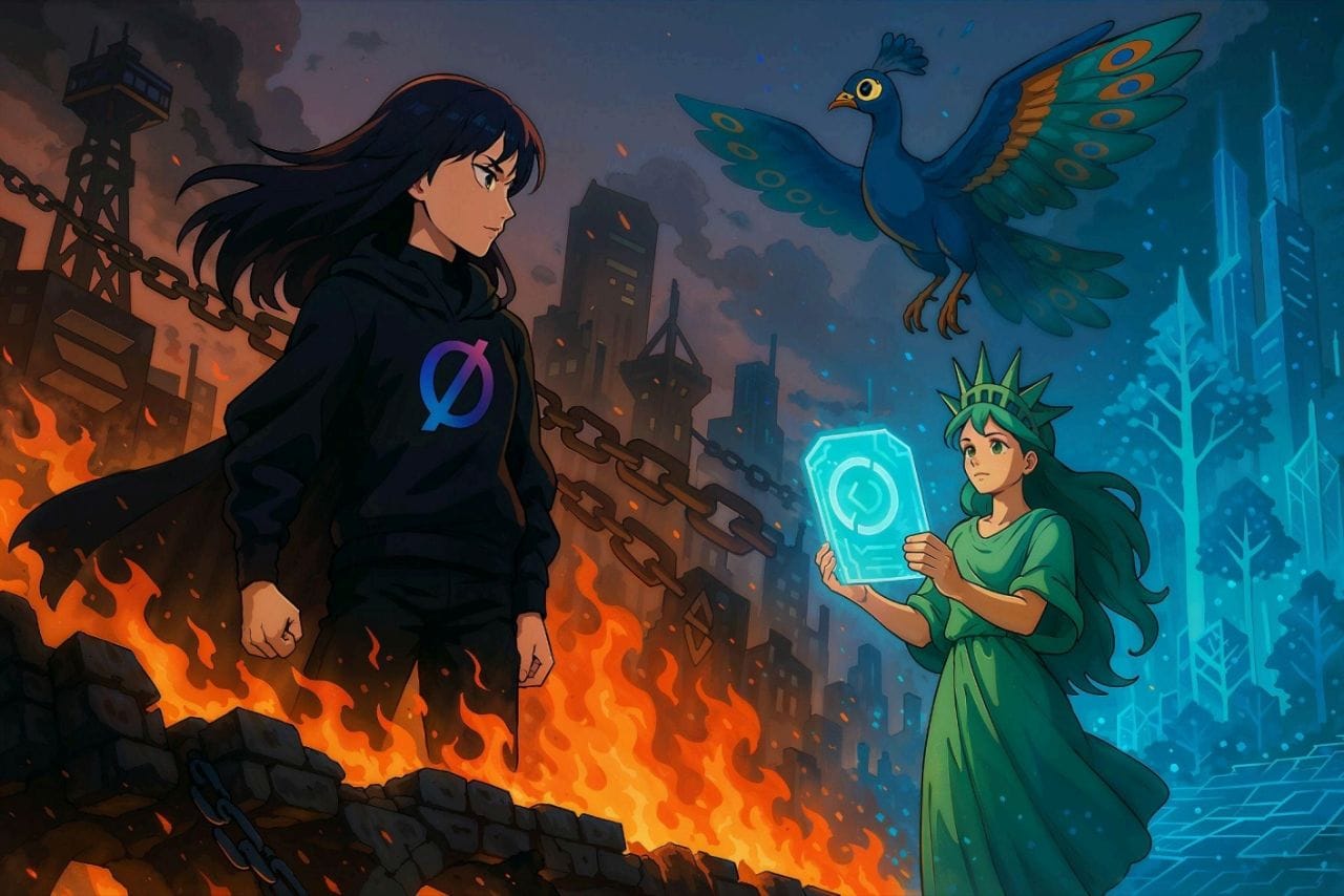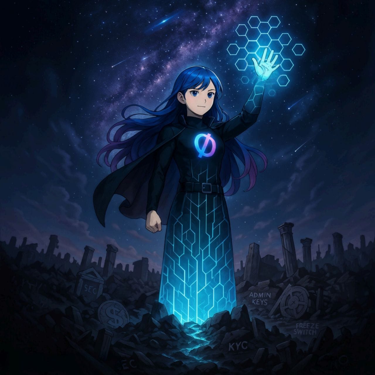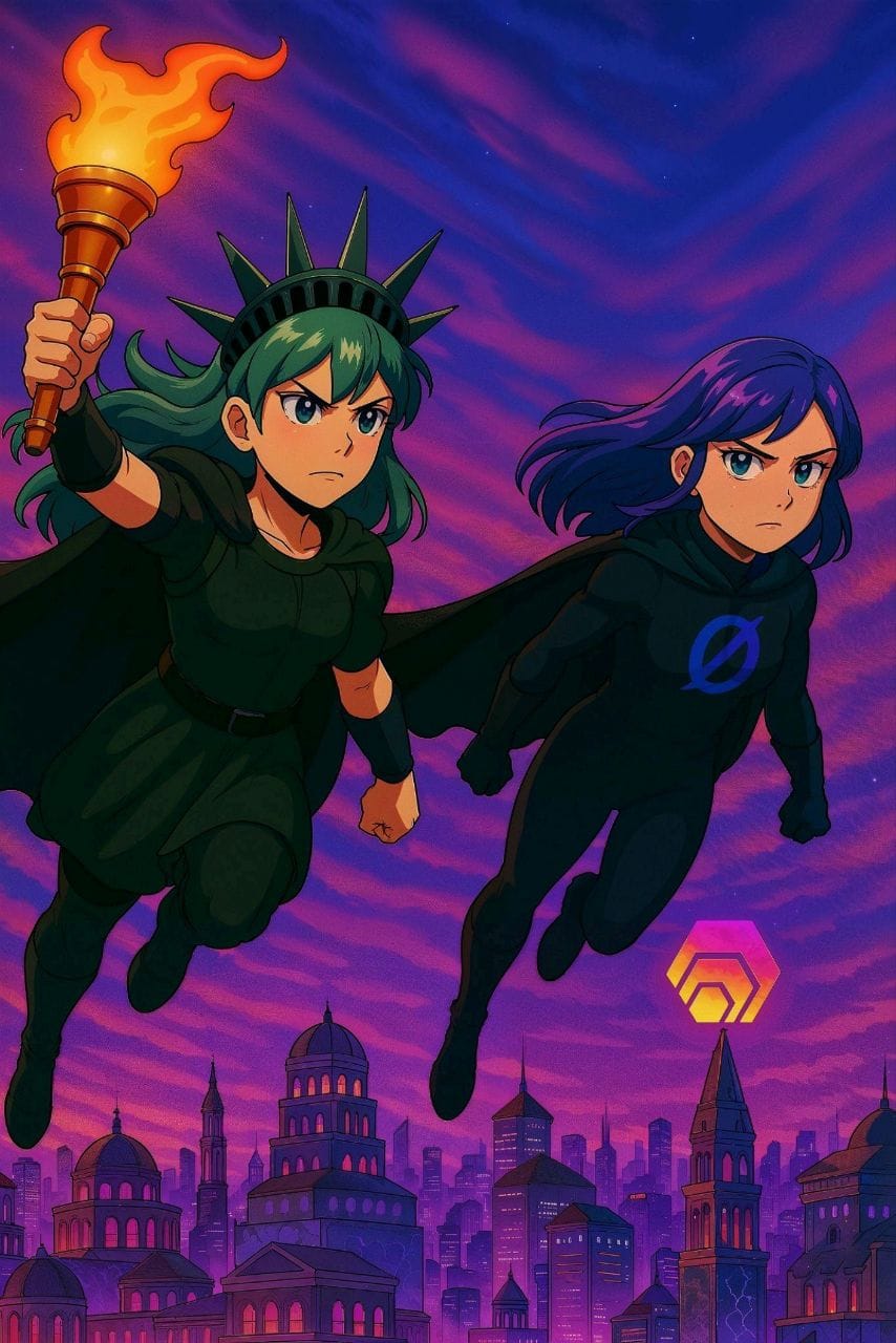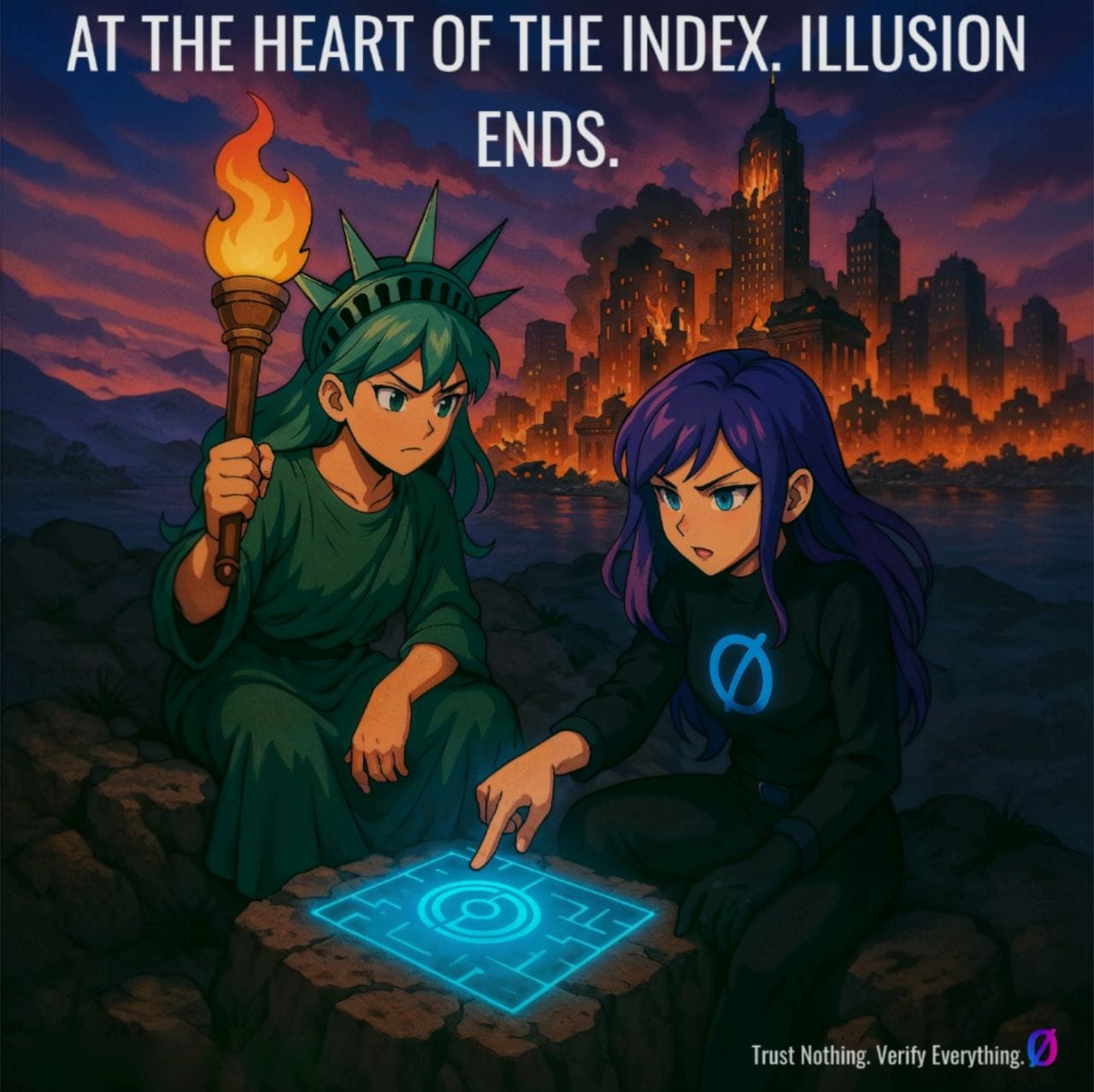 The image concept was to portray Zero and Liberty pouring over a holographic Trustless Index, with the old world falling behind them.
