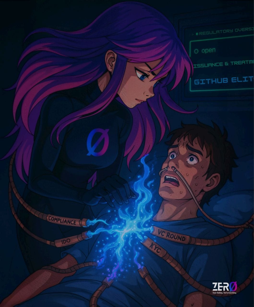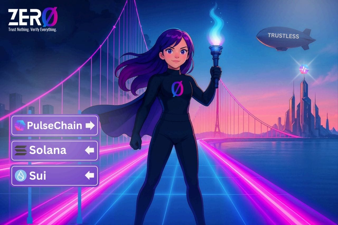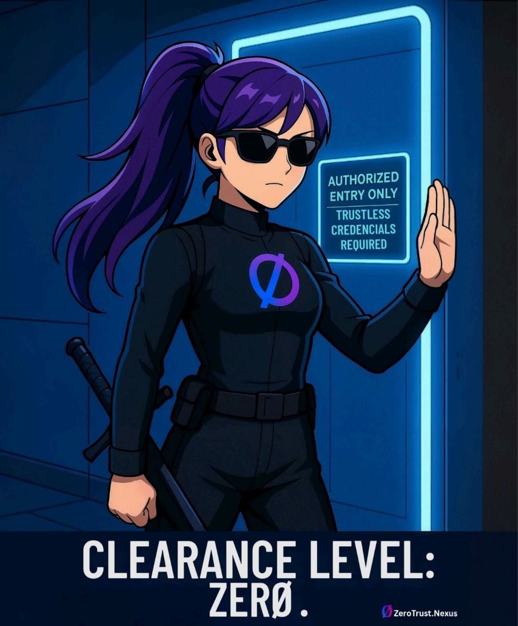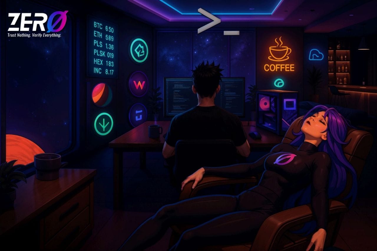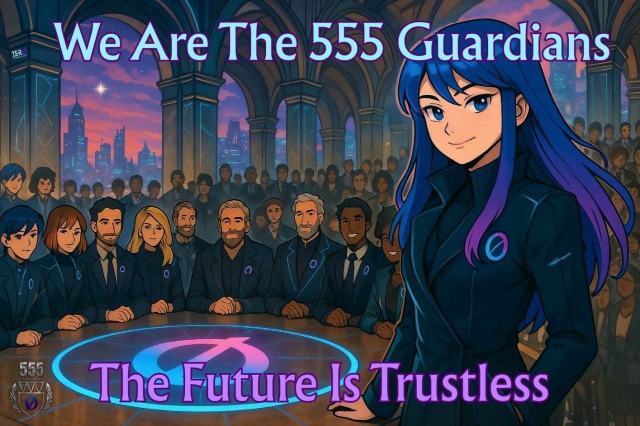 The image concept was to portray Zero and Liberty pouring over a holographic Trustless Index, with the old world falling behind them.