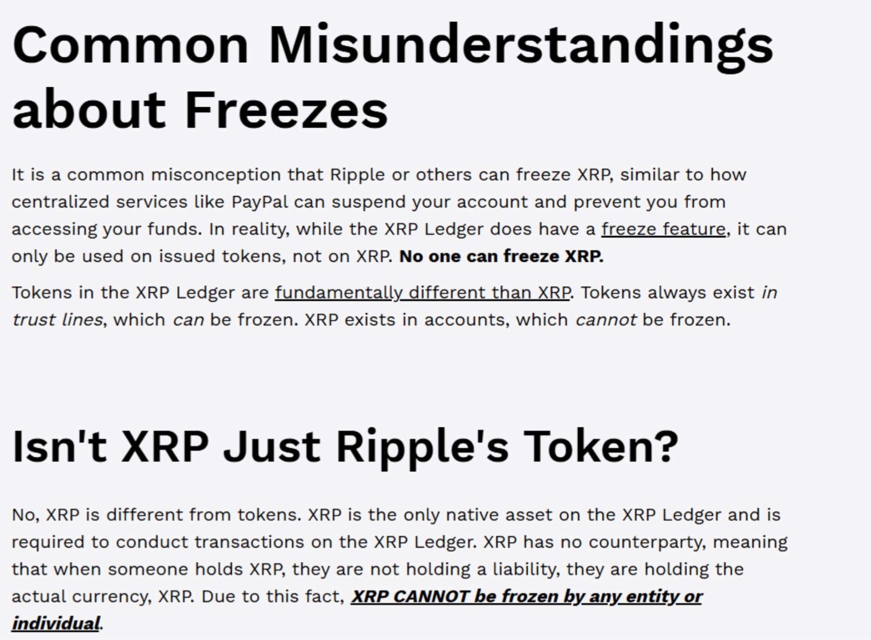 “No one can freeze XRP.” “XRP exists in accounts, which cannot be frozen.”